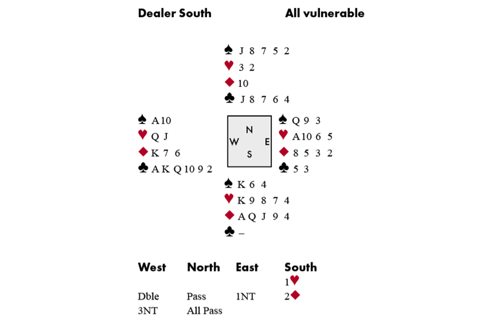 North won with his ♣J and found the best switch: a heart. David won with the ♥A, crossed to a club and ran the suit. In the four-card ending, dummy held ♠A10♥Q◆7, declarer ♠Q9♥106, and South had come down to ♠K6♥K◆A. David threw South in with a heart. South cashed his ◆A, but then had to play a spade away from his ♠K making the ♠Q David’s ninth trick. Can you see how David’s plan could have been foiled? North shouldn’t have discarded a club – because when David played the ♣10 he needed to duck it!