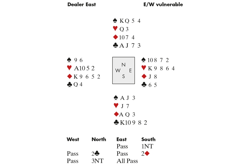 How would you view the hand when West leads the ◆5 to East’s Jack? An intermediate player would probably just assume he has to guess Clubs and get on with it. More advanced players start to get into the psychology of the game and how things look to the other side. He would not want West on lead because West knows the Diamond suit is going nowhere and is very likely to find the killing Heart switch. East, on the other hand, may well just return partner’s suit. This would suggest Declarer finessing Clubs into East’s hand.