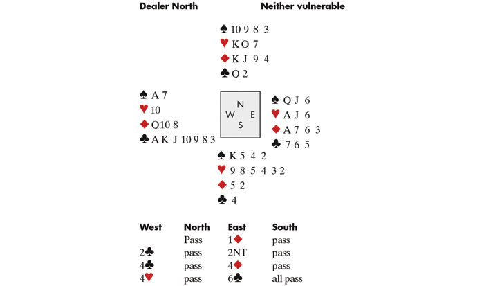 This year I’m on Sarah Dunn’s team, and there are six of us (only four play in any one match, of course) — so matches are far easier to arrange. We played — and won — our first last week. The Hubert Phillips Bowl is great fun — same-sex teams aren’t allowed; and you play one third of the match with each teammate as your partner. My teammates were David Ewart, Nick Boss, and Richard Johnson, and I won’t pretend I didn’t enjoy the novelty of being the only female — it was rather like being asked to dance every dance. David waltzed us to success in this slam (he was West).