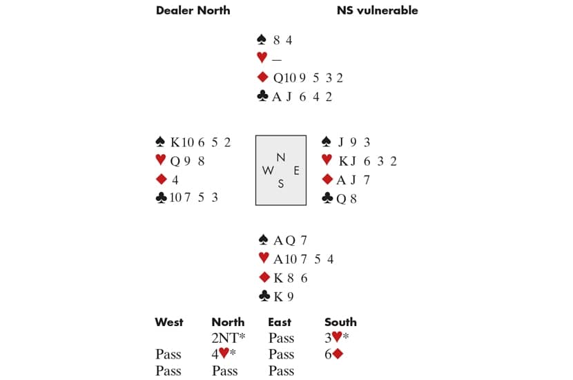North’s 2NT showed both minors. 3♥ asked: 4♥ showed 6–5 and a void. West led the ♠2 (playing 3/5th leads) and Artur (South) captured East’s ♠J with his ♠Q. Next he played a diamond towards dummy, and called for the ◆Q. ‘Did you say ◆Q?’ asked East. Artur nodded — and East won with the ◆A. Poor East’s question had already told Artur where the ◆J was. East returned the ♠9. Artur won, ruffed a heart, played a diamond to the ◆8, ruffed a heart, played a diamond to the ◆K, ruffed a heart, and came back to hand with the ♣K. Next he cashed the ♥A, and without pause, West discarded a club. Artur took stock. He knew West’s distribution was 5314. West’s first two spade discards had been easy. But his third club discard had also come easily: he hadn’t wanted to release his ♠K in case Artur had the ♠8. But surely holding four clubs to the queen he’d have had more of a problem, more to consider? So Artur decided East had started with ♣Q8. He played a club to the ♣A, dropping the ♣Q, and claimed.