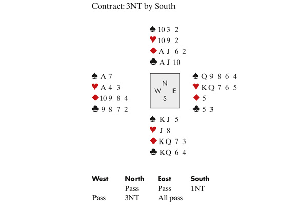 The room was in 3NT;  most Wests led the 10. There are 8 tricks on top; how do you stop the opponents switching to hearts before you can get a 9th? Some declarers won with the ♦A and played a spade to the ♠K, hoping East would duck with the ♠A; others ran their 8 winners, hoping the opponents would have discarding problems. No one succeeded. Zia, however, made an overtrick. How? On winning the first trick with the ♦A, he played a heart to the J! Who could blame West for winning and switching to ace and another spade?
