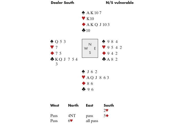 West led ♣K; East overtook and returned a club. Rob ruffed. Next he played the ♥K, overtaking with his ♥A. On cashing his ♥Q he got the bad news. But all was not lost: time to reduce his trumps. He cashed two diamonds and carefully ruffed a third. Now a spade to the ♠A and another diamond ruff. And now — a spade to the ♠10! When that held, he simply ran his diamonds, forcing East eventually to ruff from his ♥95.