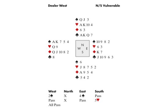 East’s first double was unsound — why not just take the money? — and Jonathan made the great decision to pull to 4NT. The second double was pure fury!