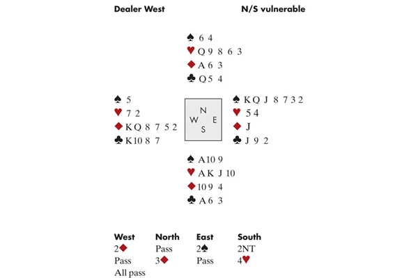 Here is Martin declaring 4♥, in the unusual position of having a choice of which hapless opponent to throw in: