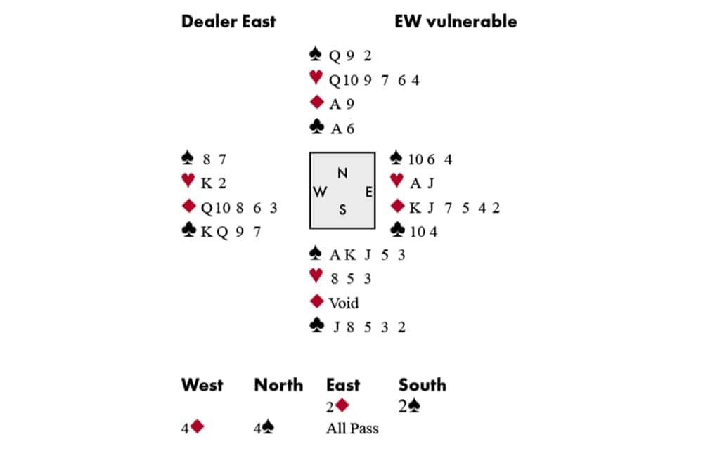 Today’s hand shows Sweden’s Frederic Wrang, playing with Antonio Palma for Ventin, finding an unusual and interesting defence against 4♠ (see diagram).