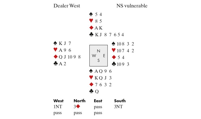 West lead the ♣4 against a rather pushy 6NT. One or two things would have to be right. Alex won with the ♣K and finessed the ♣10 immediately. Then he played a spade to the ♠8, rectifying the count for a possible squeeze. West won and returned the ♣J. Alex won, cashed the ♣A, crossed to the ♥A, cashed the ♠A, and cashed the rest of his hearts, praying for a 3-3 break. On the play of the fourth heart, this was position: N: ♥Q ♦K4 ♣5, S: ♠J ♦A103, W: ♦J95 ♣9, E: ♠K ♦Q87. First East had to let go of a diamond to protect his ♠K, so declarer chucked his ♠J, then West had to release a diamond to protect his ♣9 — which meant Alex could cash three diamonds for the best result in the room.