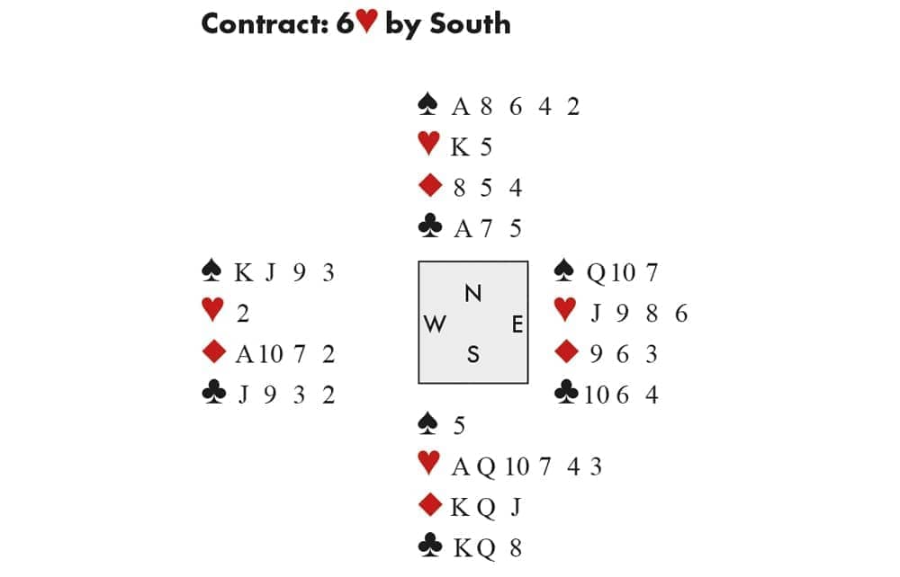 Against 6♥, West led the ♦A and continued the suit. The only thing that could go wrong was a bad heart split: if West held Jxxx there was no hope, but if East did, she might prevail via a trump coup. To reduce her trumps to the same number as East, she began by cashing the ♠A and ruffing a spade. Then came the ♥A and a heart to the ♥K (West showing out), followed by another spade ruff. She now cashed her minor suit winners, ending in dummy with the A♣, and in the 2-card ending, a spade from dummy caught East’s ♥J under her ♥Q10.