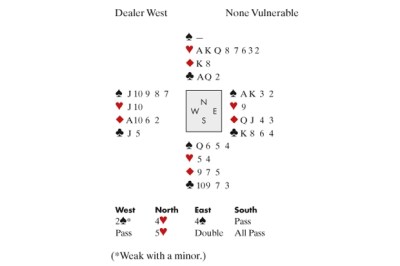 Notice how Cronier, despite holding 24 points, chose to open at the one level to keep the auction under control. West led the ♣Q. Philippe won and cashed the A, on which East threw a Diamond. This could only be from an original holding of five or more, so Philippe played a trump to dummy’s seven, and a Diamond towards hand. East inserted the Jack, but declarer won and followed with another trump to dummy, this time in order to take the Spade finesse. Now he drew the last two trumps ending in dummy, played a Diamond to the ten and cashed the last trump in hand. Poor East had to hold his two Diamonds and Kx of Spades, and was inevitably thrown in with the Diamond to lead from his ♠K at trick twelve.