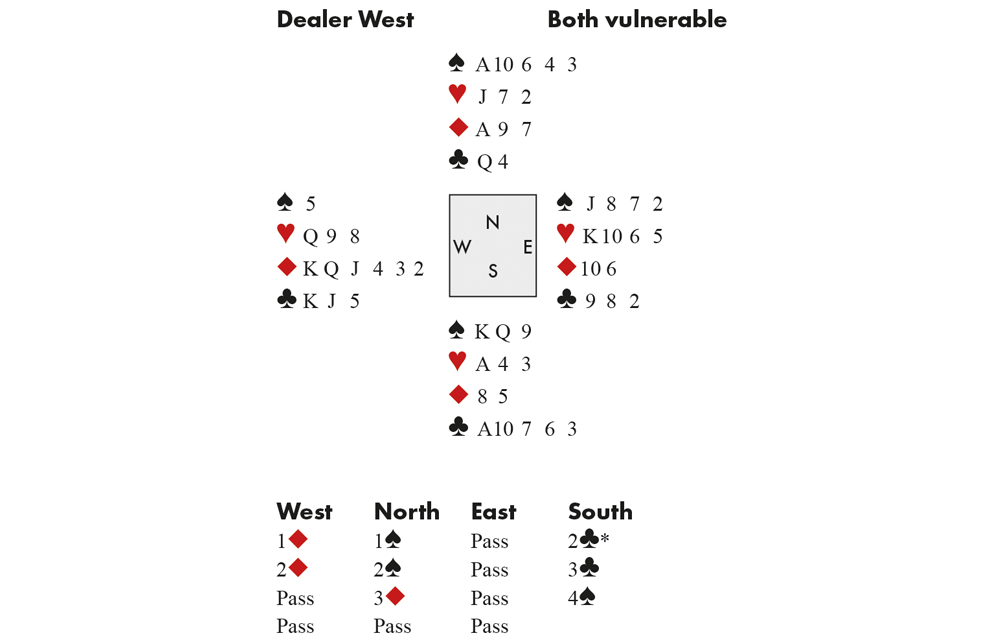 (2♣ showed a sound spade raise.) East led the ◆10 to West’s ◆J and Robson’s ◆A. Robson crossed to the ♠K and played a low club. West rose with the ♣K, cashed the ◆K and switched to the ♥8, covered by the ♥J, ♥K and ♥A. A club to the ♣Q was followed by a long think, and …a spade to the ♠9! Next came the ♣A10 for two heart discards. East ruffed the fourth round and returned a heart. Robson ruffed, crossed to the ♠Q and threw his last diamond on the ♣7. So how did Robson read the position? West had six diamonds. The ♥8 switch, covered by the jack and king, suggested that he held the ♥Q98. As for clubs, a 3-3 break was required to discard red-suit losers. That left West with 1-3-6-3 shape. A test passed with flying colours!