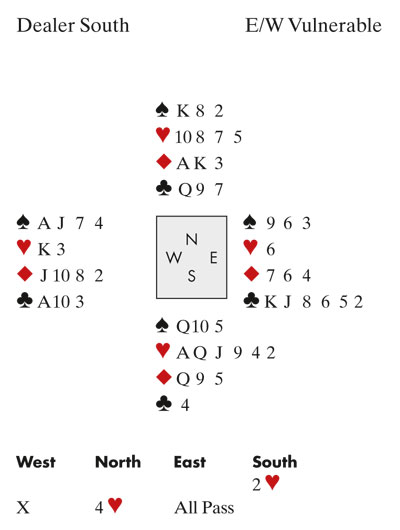 Dessy was South, and ended up in 4 hearts after opening a constructive Weak Two. She won the diamond lead and lost the trump finesse to West, who continued diamonds. Now she won in hand, drew the last trump and played a club to the Queen and King, East returning his last diamond.