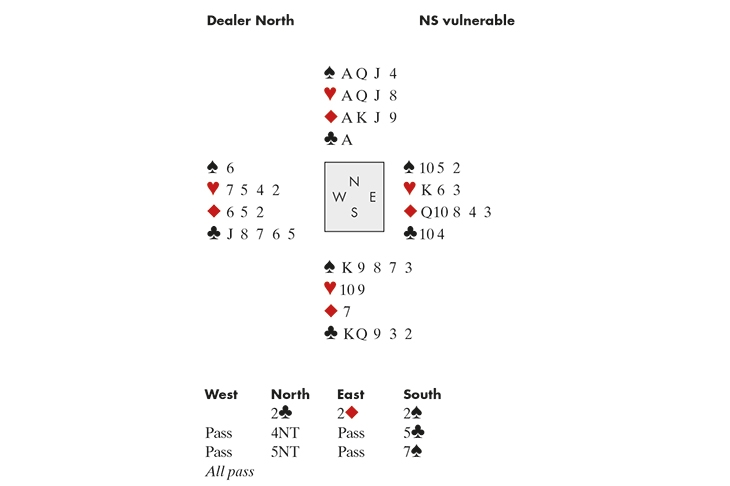 East’s 2♦ was the sort of obstructive bid players make at favourable vulnerability. West led the♦2. Brian won with the ace, cashed the ♠AQ, and ♣A, and came to hand with the ♠K. Next he cashed the ♣KQ. Had trumps split 2–2 or clubs 4–3, slam was cold. Now he had to make a choice: should he finesse the ♥K, or pitch a heart on the ♦K and take a ruffing finesse? Would East have overcalled with just a queen? Yet West surely held longer hearts so, a priori, was more likely to hold the ♥K. Brian thought long and hard, led a heart and… West piped up with: ‘Seems like one off.’ At which point Brian confidently played the ♥A, discarded a heart on the ♦K, and took the ruffing finesse!