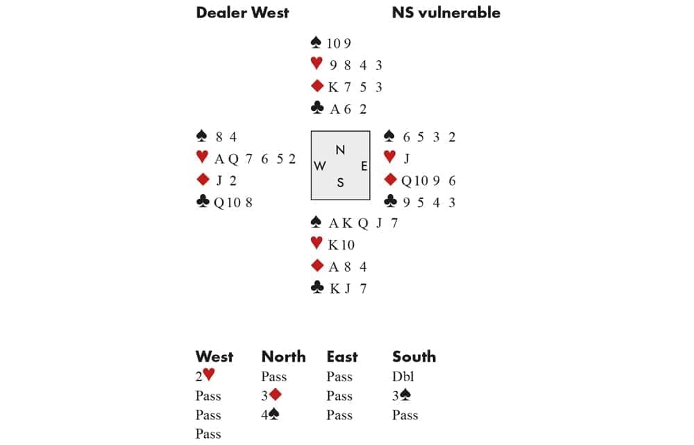 Recently, a friend was browsing through the bridge books on my shelves, when suddenly she burst out laughing. ‘Here’s a funny one,’ she said. ‘It’s called Loser on Loser Play.’ Why would anyone want to read a book by a loser on how to lose? Given that she’s only recently learnt how to play – by recently, I mean two years ago, which is the blink of an eye for a bridge player – I explained that it’s a fairly common technique which involves substituting one loser for another. You might do it for a number of reasons, for instance to force a particular opponent to be on lead, or to reduce two losers to one by creating a trick. She looked ever more perplexed (it’s a surprisingly difficult concept to explain), so I gave her this example, played by Patrick Lawrence the previous week in a teams match against me.