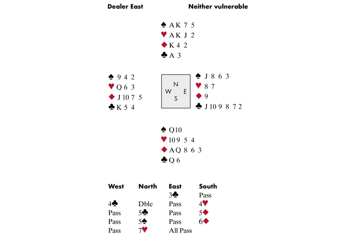 Weinstein and his partner Bobby Levin were as obstructive as possible in the bidding, but NS nevertheless reached a grand slam, which, as you can see, makes on a trump finesse. At least, it was going to make — until Weinstein led the ♥3! Declarer, never believing he would lead away from the queen, rose with the ♥A and cashed the ♥K. One down. Put that in your hat, Mrs du Maurier!