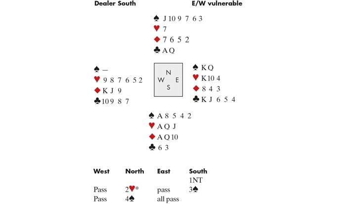 (*Transfer). West led the ♣10. I rose with the♣A, crossed to the ♥A and played the ♥Q. My plan, if West covered, was to ruff, cross back with the ♠A and discard my losing club on the ♥J. But West played low, I discarded the♣Q, East won and returned a diamond; I played the ♦10 to West’s ♦J. He returned a club. I ruffed, and played ♠A and another spade. East won and played a second diamond: one down. If only I’d pretended that my queen and jack were two small hearts, I’d have known what to do: win the club lead, play a heart to the ace, ruff a heart — so what if I was ruffing royalty! — play a trump to the ace, ruff another heart and exit with a club. When East switches to a diamond, West wins but is end-played.