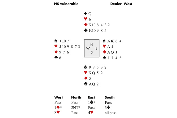 Sitting North, I led the ♦J, which ran round to declarer’s ♦K. Declarer began by playing on spades. Lou won the second spade and exited with her third. Declarer cashed his last spade and now thought for ages before deciding to try to end-play South in the hope she was short in clubs. He cashed the ace and king of clubs, and the ace of hearts, and then played the ♥3. Now it was Lou’s turn to think. Had Lou ducked, declarer could have won with the ♥10 or ♥Q. Now he would be up to eight tricks, and could exit with a heart: Lou could cash two hearts and the A♦ but she would then be forced to play a diamond to the ♦Q. So Lou hopped up with the ♥K and now — crucially — cashed the ♦A and exited with a diamond to lock declarer in dummy. The last two clubs went to me — one down.