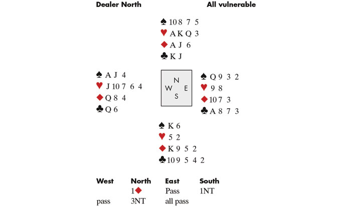 West took some time about her return, clearly thinking of a Spade shift, but eventually played a second Heart to dummy. Declarer played a Diamond to hand and finessed the Jack, followed by the Ace. Good news! If he could only get to hand with the King of Spades, he actually had nine tricks; four Diamonds, three Hearts and two Black tricks.