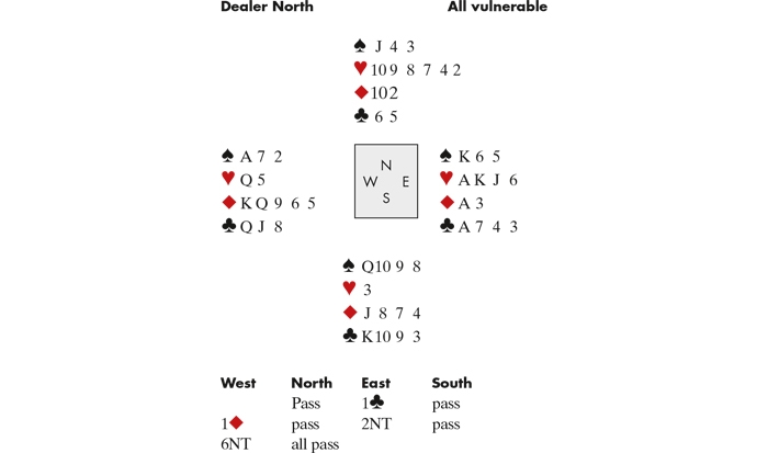 Well done to Janet and her team for their victory at the London Easter Congress. My own team — David Gold, Peter Taylor and Ingar Hansen — were lying first equal at one point, but ended up slipping to tenth after Janet and her crew beat us in our head-to-head match. I seem to have been jinxed by the number 10, as David and I came tenth in the Pairs too. I wish I could say we didn’t have much luck. The trouble is, the hand that sticks in my mind is one where we got very lucky indeed: I made a poor lead against a slam but our opponent managed to go down by making an even worse play. Although I didn’t give the slam much thought at the time, I was chatting to Peter Taylor about it afterwards, and he said how surprised he was that half the field had gone down, when in fact a simple squeeze brings it home:
