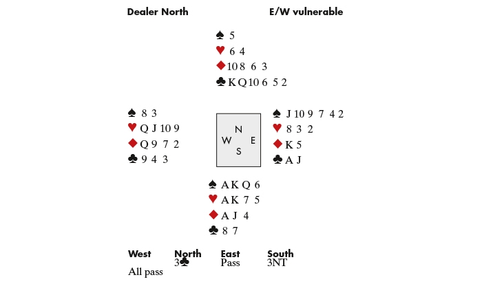 South played in the intended 3NT on a Heart lead. Seasoned bookworms will recognise the problem: the defence will duck one round of Clubs. South uses this entry to play a Diamond to the Jack, which, if West takes it, will give him three Diamonds to go with his six tricks in the other suits.