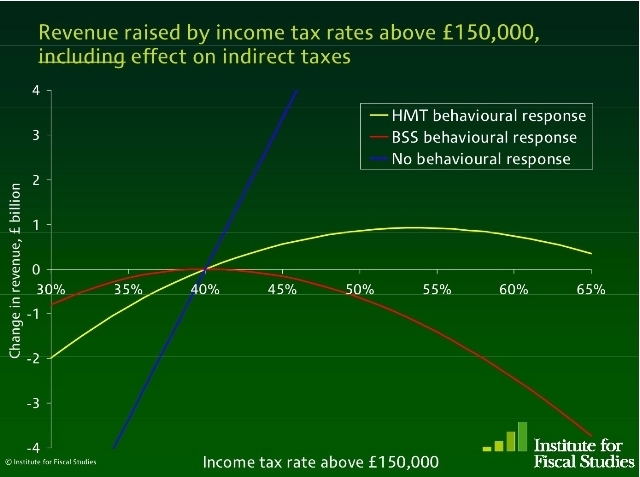What fascinated me was to see three rival Laffer-esque curves – everything depends on the assumptions. The Treasury use their own curve, the workings of which are a mystery but helpfully make the case for a 50p tax. The IFS curve (in red, below) makes the case against a 50p tax. If this were America, there would be scores of taxpayer-championing think tanks scrutinising the assumptions in these curves, and working out if they justify high taxes. It’s not static scoring: that is in blue. So here, for the first time ever, the Treasury’s deformed and highly suspicious Laffer curve (yellow). Seriously, debates about the assumptions behind these curves will define Britain’s fiscal future: