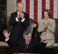 Gordon Brown is about to deliver his speech to a Joint Session of Congress. When Blair addressed one in 2003, he received 19 standing ovations. Brown by having the Queen offer the ailing Teddy Kennedy an honorary knighthood has sweetened the mood and guaranteed him a few standing ovations.