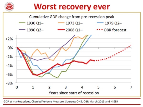 Those of a nervous disposition should not click beyond the link. What follows are a few graphs that sum up what’s very hard to spin out of: the extent to which our economic situation has worsened, and how bleak the future looks. The Chancellor started by saying he’d cut the deficit by a third, not a quarter. That’s one way of putting it. Another way is to say that debt is up 38 per cent under the coalition so far, and is set to double: