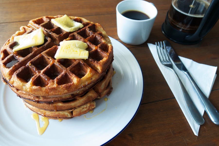 These waffles pair as perfectly with smoked streaky bacon as they do with a simple pat of butter and drizzle of maple syrup