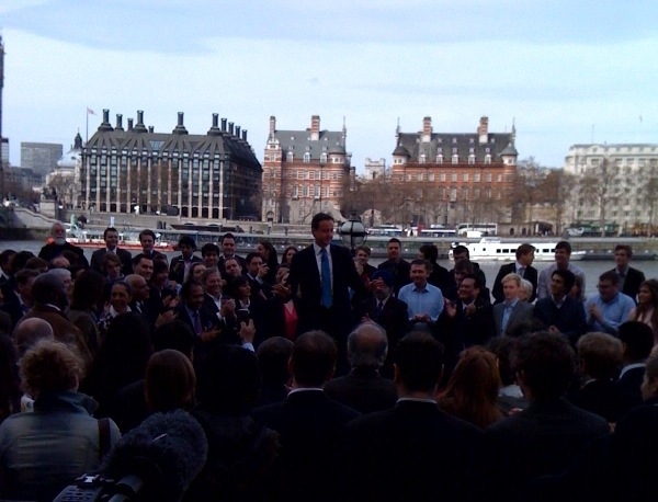 Reaganesque was the word that sprang to mind watching Cameron’s launch event. Standing on the terrace of County Hall with Parliament behind him, providing the snappers with some great images, Cameron spoke about the ‘modern Conservative alternative’ to five more years of Gordon Brown. The implicit message was youth and vigour. This was one of those occasions where the visuals matter more than what was actually said.