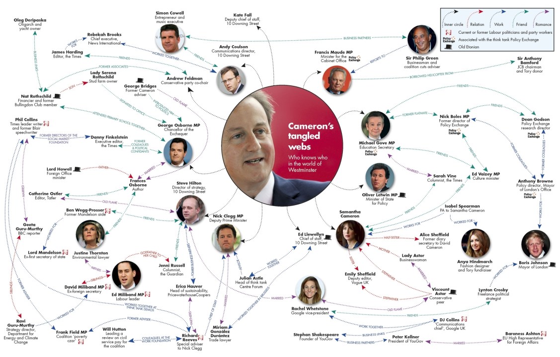 How do you get from David Cameron to Simon Cowell in two, easy steps? Answer: Andy Coulson. The former News of the World editor is, of course, Cameron’s director of communications – but he also happens to be on friendly terms with the X-Factor impresario. We set out this, and all the other tangled relationships around the Prime Minister, in a spider graph for this week’s magazine. From Nick Clegg to the designer Anya Hindmarch, from Steve Hilton to Baroness Ashton: it’s not a map of the government, but rather of the people both in and around No.10 who form what we call the New Establishment. To see them in their entirety, all CoffeeHousers need do is click on the image above, or download a pdf .