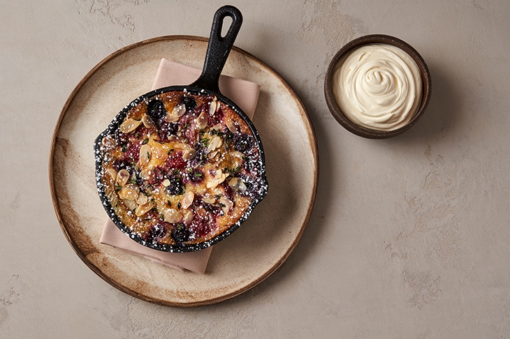 Summer fruit clafoutis with flaked almonds, lemon thyme & lavender; crème fraiche