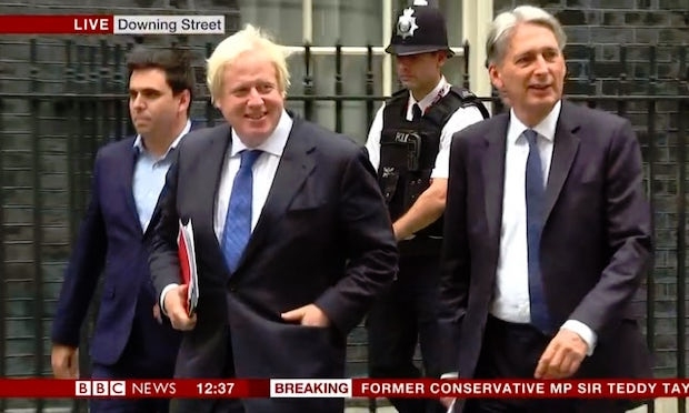 Although Johnson and Philip Hammond are reported to be on a collision course over their vision for Brexit, the pair were put on a friendly display as they exited today’s Cabinet meeting, ahead of Theresa May’s big Florence speech.