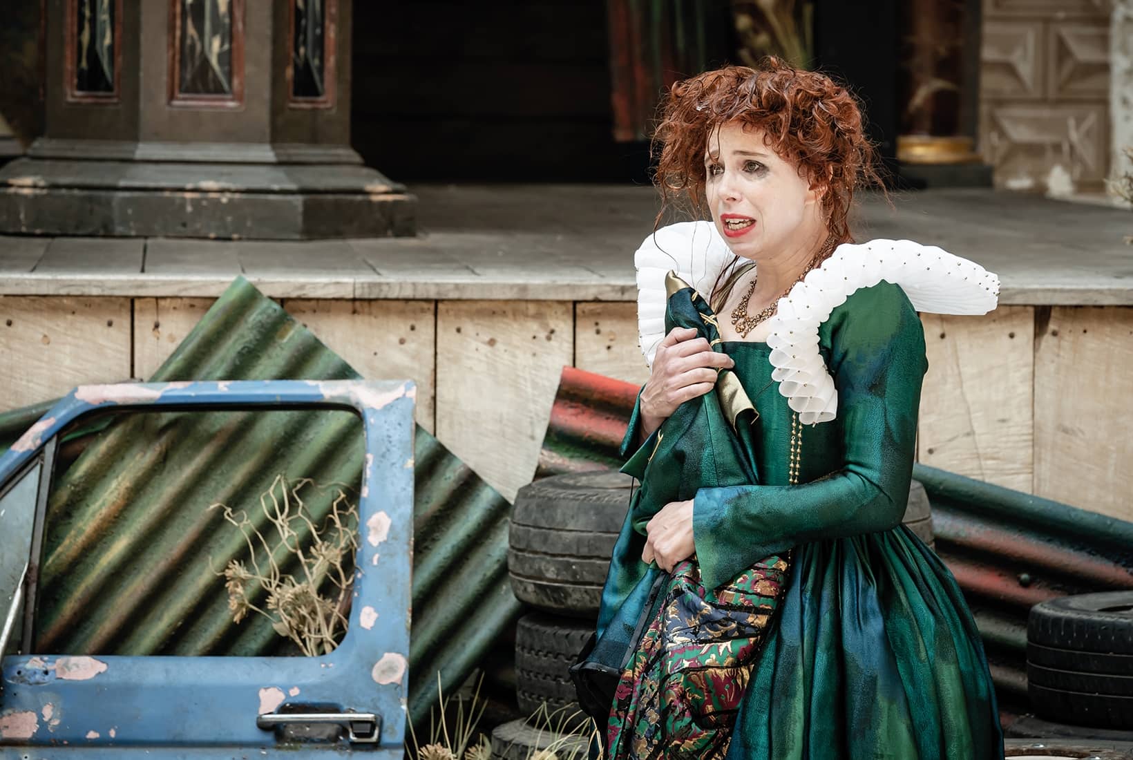 Sean Holmes’s Twelfth Night is the usual mash-up of influences and styles. The setting is partly modern and partly historic but the designer, Jean Chan, has an excellent eye and knows how to create visual effects that serve the story. The twins, Sebastian and Olivia, are dressed in matching emerald breeches and their wigs are similar so it’s understandable that everybody muddles them up. At the south-east corner of the stage is a wrecked truck which doubles as a hiding place and as a stepladder to the playing area. Neat idea. One of the guards wears the natty black togs of an LAPD cop, complete with a white helmet and aviator shades. Why? Because the costume is great to look at. No other reason is needed.