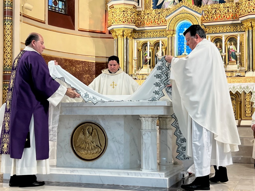 Father Michele Vricella and Deacon Michael Chirichella assisted Monsignor Grimaldi in preparing the altar, after it was stripped as a result of the desecration that took place (John Quaglione/DeSales Media)