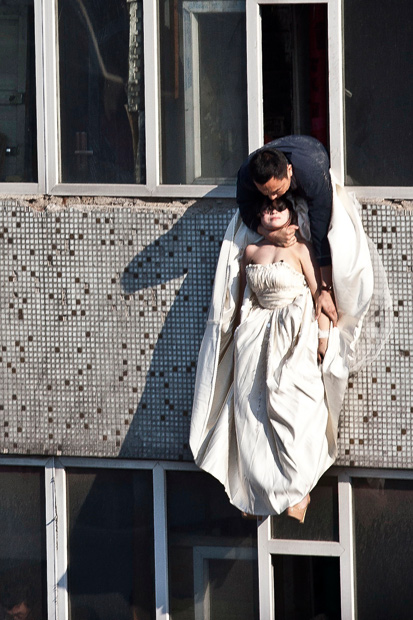The jilted bride [opposite a photo, reproduced overleaf, of a woman in a bride’s dress, held round the neck by a man]. ‘She was miraculously caught and saved by a local care worker, who grabbed her around the neck as she fell, her body dangling above the sheer drop.’