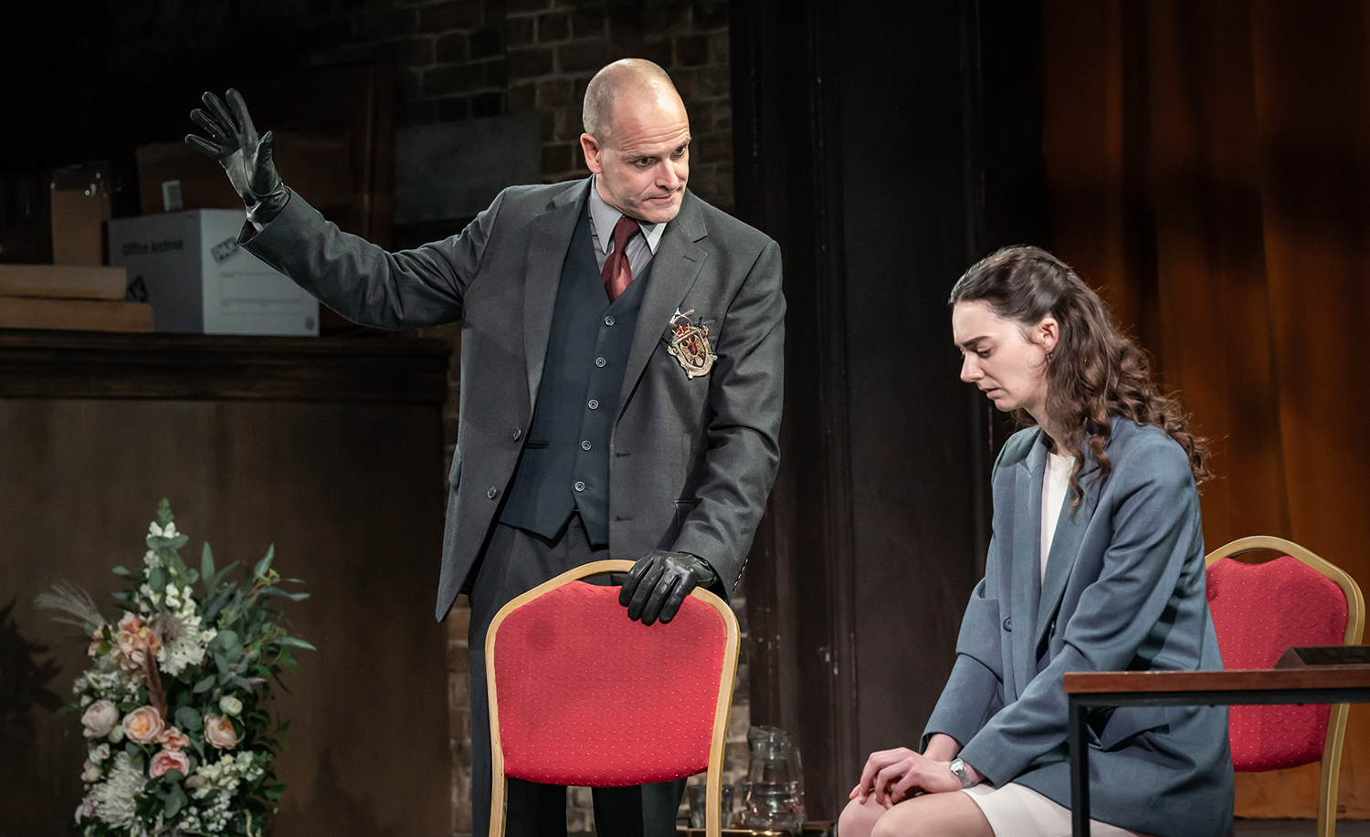 Holcroft’s new satire, A Mirror, opens with a bogus wedding that gets disrupted when a gang of cops march on stage and cancel the ceremony. A strange start. Then the play proper begins and it turns into a play-within-a-play. Or rather several plays-within-a-play. We meet Celik (Jonny Lee Miller in a pair of sinister black gloves), who works as chief censor for a Stalinist regime that restricts public access to drama. Celik enjoys his role as a cultural commissar and he encourages a promising young dramatist, Narrowman, to mimic the style of an older writer, Bex, whose acclaimed scripts help to reinforce the regime’s hold over the populace.