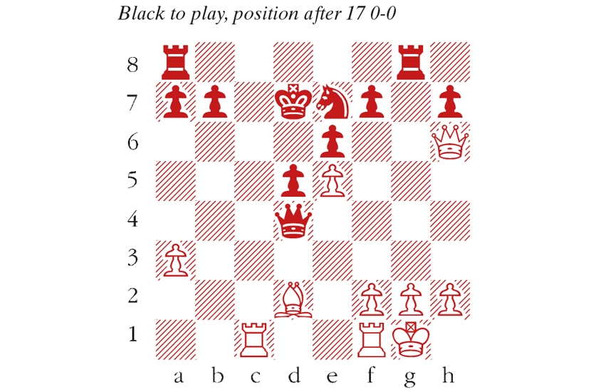 1 e4 e6 2 d4 d5 3 Nc3 Bb4 The Winawer variation of the French defence. 4 e5 c5 5 a3 Bxc3+ 6 bxc3 Ne7 7 Qg4 cxd4 8 cxd4 This natural capture is unusual. Instead 8 Qxg7 Rg8 9 Qxh7 Qc7 leads to the ultra-sharp ‘poisoned-pawn’ variation. 8…Qc7 9 Bd2 Qxc2 10 Qxg7 Rg8 11 Qh6 Nbc6 12 Nf3 Qb2 13 Rc1 Nxd4 14 Nxd4 Qxd4 15 Bb5+ 15 Qe3 was better, hoping to defend the endgame a pawn down. Bd7 16 Bxd7+ Kxd7 In the French defence, Black’s king is often surprisingly comfortable on d7. 17 O-O Walking into a devastating combination — see diagram. Rxg2+! 18 Kxg2 18 Kh1 Rxf2 is equally hopeless. Qg4+ 19 Kh1 Qf3+ 20 Kg1 Rg8+ 21 Bg5 Qg4+ 22 Kh1 Rxg5 23 Rg1 Qf3+ White resigns