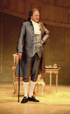 Tony Gardner, a natural like Keith, approaches the thankless role of Faulkland with undaunted gusto. The sulky resentfulness of his character operates as a foil to the dash and vigour of Captain Jack, but Gardner turns Faulkland’s priggish disaffection into something fresh, funny and even a little pitiful. Peter Bowles has an even stranger take on his role. Sir Anthony Absolute is usually played as a decent old charmer with a tyrannical streak. Bowles dismantles the part and reassembles it from scratch, placing tyranny at the centre and soft-focusing the charm and decency. It’s an amazing act of restoration. In the key scene where he browbeats his feckless heir, Bowles gradually lowers the volume and slows the heart-beat of the performance to suggest levels of menace and thuggery which are oddly disturbing but never lose touch with the glitter and polish of the comedy. It’s hard to imagine that Sheridan, of all writers, could feel Pinteresque. A piece of comic brilliance.