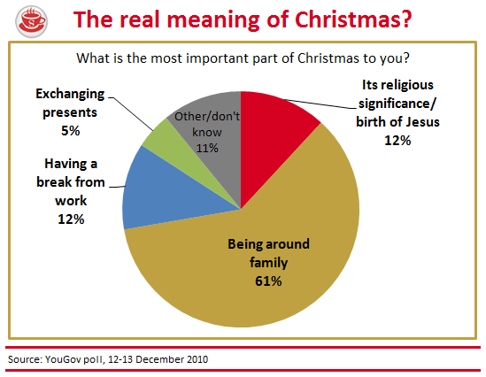 But no such restrictions on the Internet, of course — so we thought CoffeeHousers might care to see some of the festive factoids we had poised to print. Among them were the poll findings shown in the chart above: only 12 per cent of people regard the religious significance of Christmas as its most important component. And here are more for you to mull over, collected from various YouGov surveys: