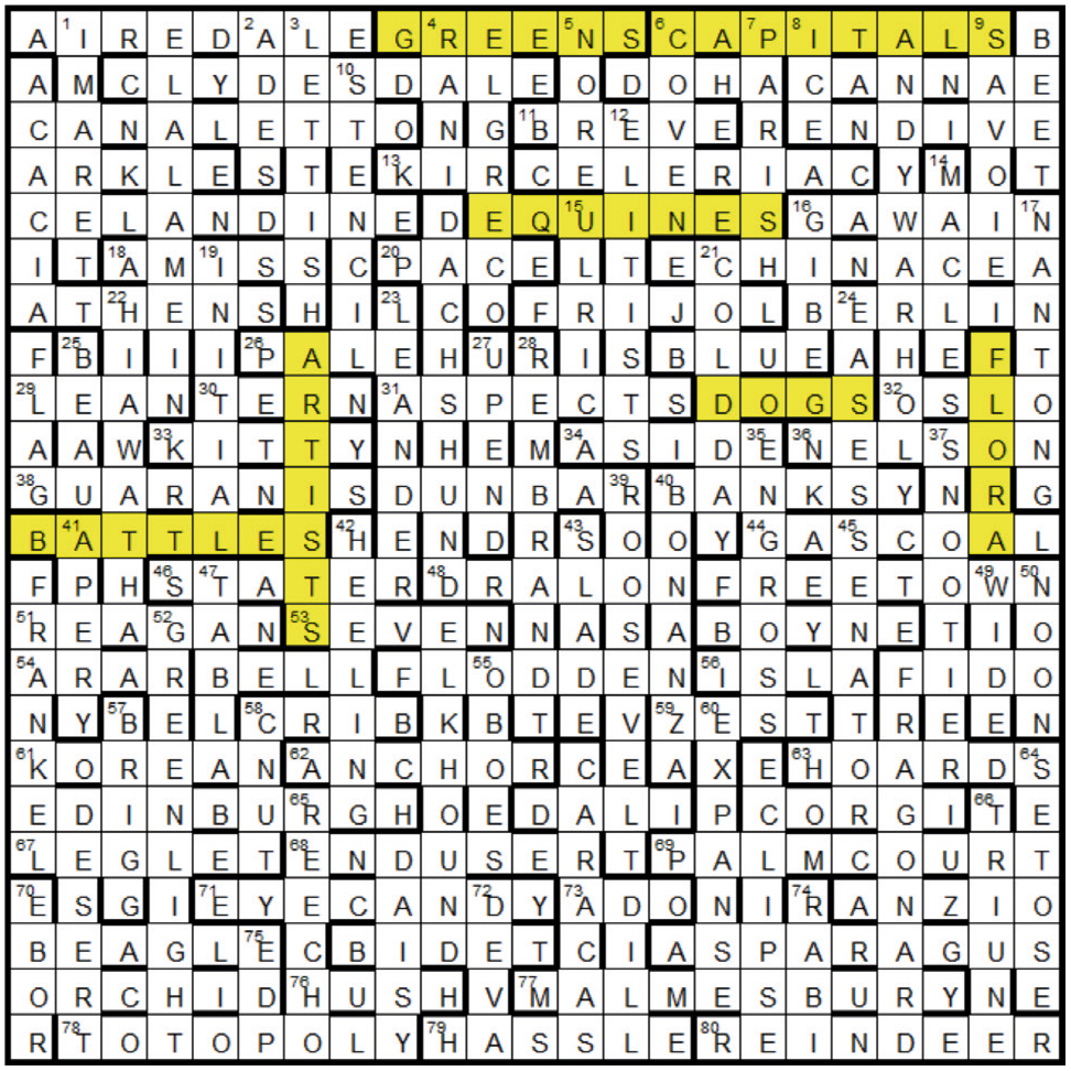 The unclued lights comprise the seven themes (here in upper case) and six theme-words beginning with A to F.