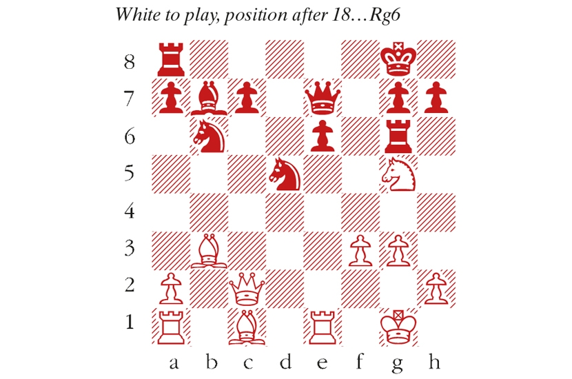 1 c4 e5 2 Nc3 Nf6 3 g3 Bb4 4 e4 Bxc3 5 bxc3 O-O 6 f3 b5!? 7 d4 7 cxb5 d5 gives Black some initiative. 7… exd4 8 cxd4 bxc4 9 e5 Nd5 10 Bxc4 Bb7 11 Nh3 d6 12 O-O Nd7 13 Re1 dxe5 14 dxe5 N7b6 15 Bb3 Qe7 16 e6! fxe6 16…f6 was more stubborn. 17 Ng5 Rf6 18 Qc2 Rg6 (see diagram) 19 Rxe6! Qxe6 20 Nxe6 Rxe6 21 Bb2 Rae8 22 Bd4 Kh8 23 Qf5 Bc8 24 Qh5 c5 25 Bxc5 Re5 26 Qf7 Bh3 27 Bf8 Re1+ 28 Rxe1 Rxe1+ 29 Kf2 Rf1+ 30 Ke2 Nc3+ 31 Kd3 Black resigns