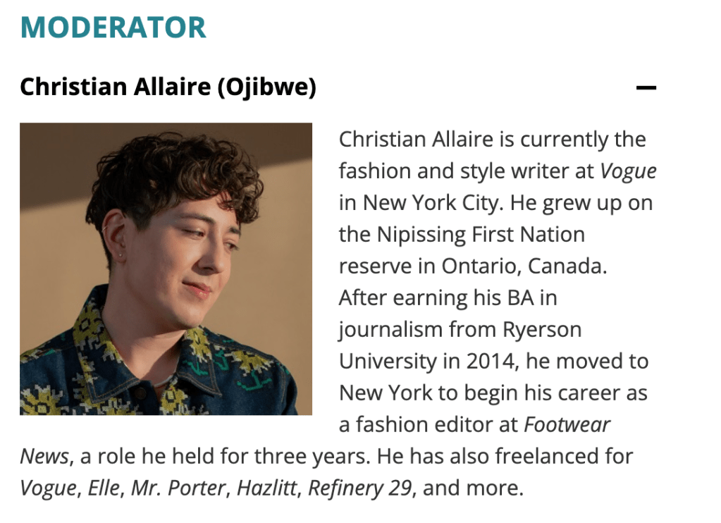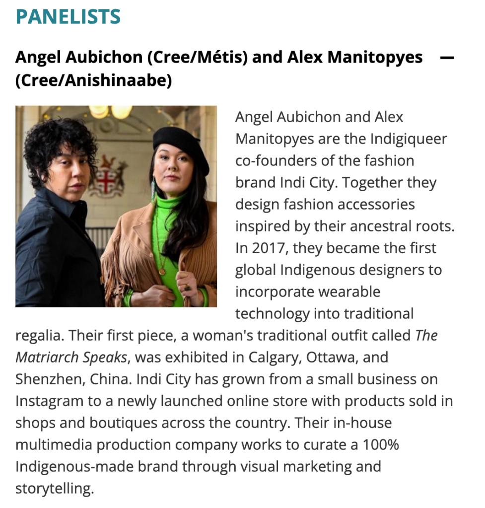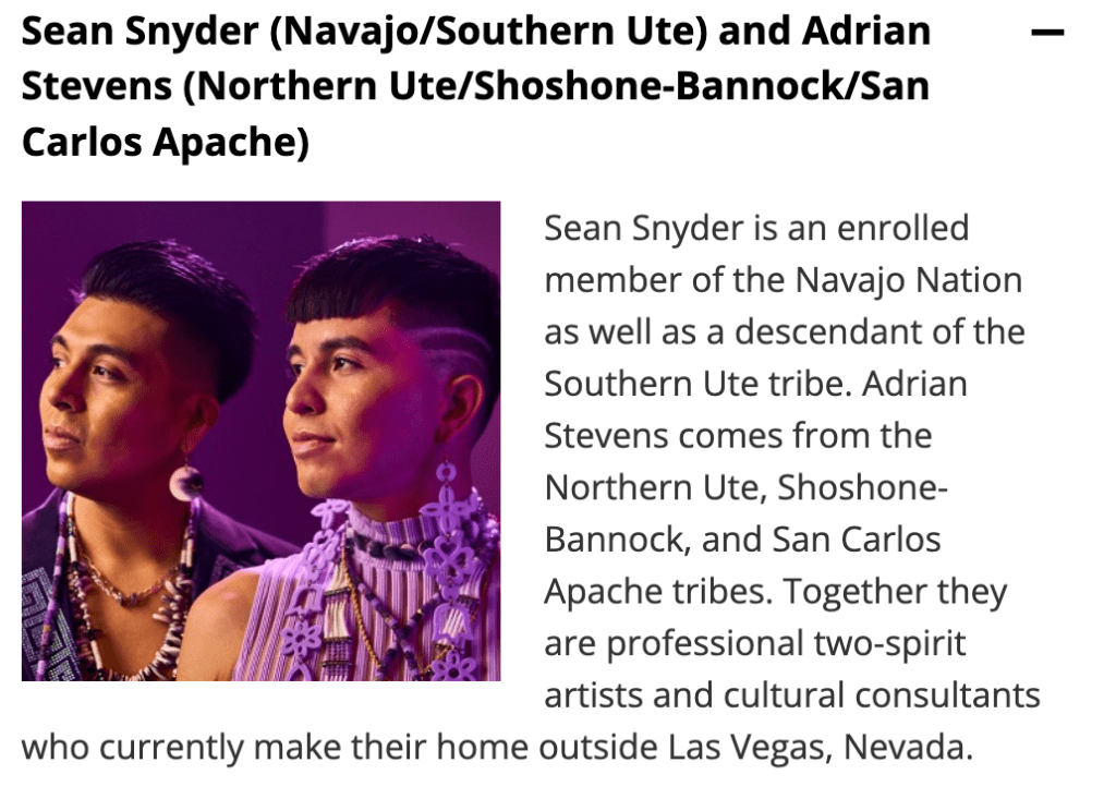 There are four panelists. Sean Snyder and Adrian Stevens, who are “professional two-spirit artists and cultural consultants,” and Angel Aubichonand Alex Manitopyes, who are Indigiqueer fashionistas, will be the guides.