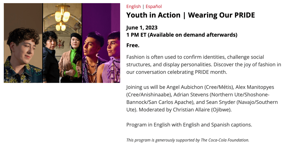 “Fashion is often used to confirm identities, challenge social structures and display personalities,” the event description reads. “Discover the joy of fashion in our conversation celebrating PRIDE month.”