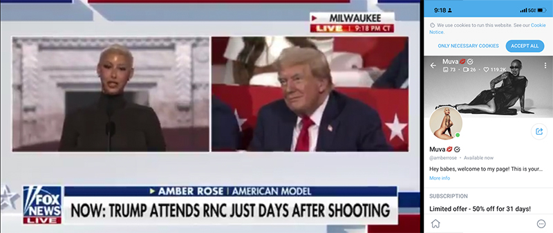 Congratulations to Amber Rose, who this week became the first party convention speaker in America to be “available now” on OnlyFans during her remarks (check the timestamps). Rose’s remarks were the most warmly received on Monday. “I realized Donald Trump and his supporters don’t care if you’re black, white, gay or straight. It’s all love,” she said.
