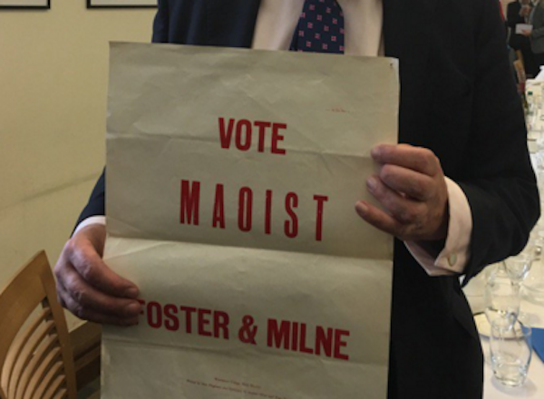 Today’s lobby lunch was the cause of much amusement among hacks. John Whittingdale used his speech to cast a light on Labour spinner Seumas Milne’s school days. The Culture Secretary recounted his time at Winchester College with Milne. He said that during this time, Milne co-authored a manifesto supporting Chinese communist dictator Chairman Mao. What’s more he even posed for a photo with the election poster in question: