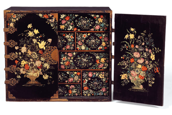 Secret Splendour takes one into the world of the 17th-century collector and how he housed and displayed his collections. These he would place in his most swanky piece of furniture, the cabinet, which he would have had decorated with tortoiseshell, embossed silver, inlaid tropical woods, or painted and japanned in the oriental style. The most expensive cabinets were imported from Japan or China, but they were also made all over Europe, particularly in Augsburg, Antwerp, Eger, Paris, Naples and even London, and it is the European cabinet in all its varied forms that is on show in this exhibition.