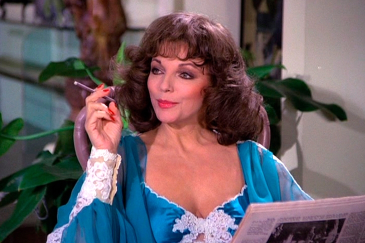 Then there was glam rock. When I wasn’t mainlining Hollywood, I was staggering around in silver platformed boots at the local teenybopper disco to songs like ‘The Bitch is Back’ (Elton John) and ‘Queen Bitch’ (David Bowie) absolutely delighted that men could be bitches, too. The following morning I would lurk in my purple bedroom with the curtains closed and calm my Babycham hangover with nuggets from the twin titans of literary bitchery, Oscar Wilde and Dorothy Parker. The great luxe soap operas — Dallas, 1978–91 and Dynasty, 1981–89 — were just around the corner and in their spotlight were a brace of brilliant bitches; Sue Ellen Ewing, played by Linda Gray, and Alexis Carrington Colby — not so much played as taken out like a Borzoi on a long lead by the ultimate bitch-goddess, Joan Collins. She summed up the difference with which men and women are treated: ‘I wouldn’t be “nice” to studio heads and it gave me a reputation of being a bitch because being witty and hard was accepted in men like Noël Coward and Oscar Wilde but not in a young woman.’