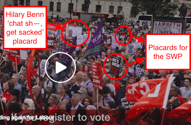 However, judging by the main photo one could be forgiven for thinking it was a site for the Socialist Workers Party. Although the site is designed to ‘help get Jeremy re-elected as Labour leader’, in the photo — from a march in support of Corbyn — there are several SWP placards as well as a charming sign with a picture of Hilary Benn — and the caption ‘chat sh–, get sacked’: