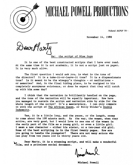Michael Powell, of Powell and Pressburger fame, replies to a script, titled ‘Wiseguys’, sent by Martin Scorcese for the master’s prognosis. The screenplay had been based on Nicholas Pileggi’s book Wiseguy (1986). ‘Wiseguys’, of course, became Goodfellas.