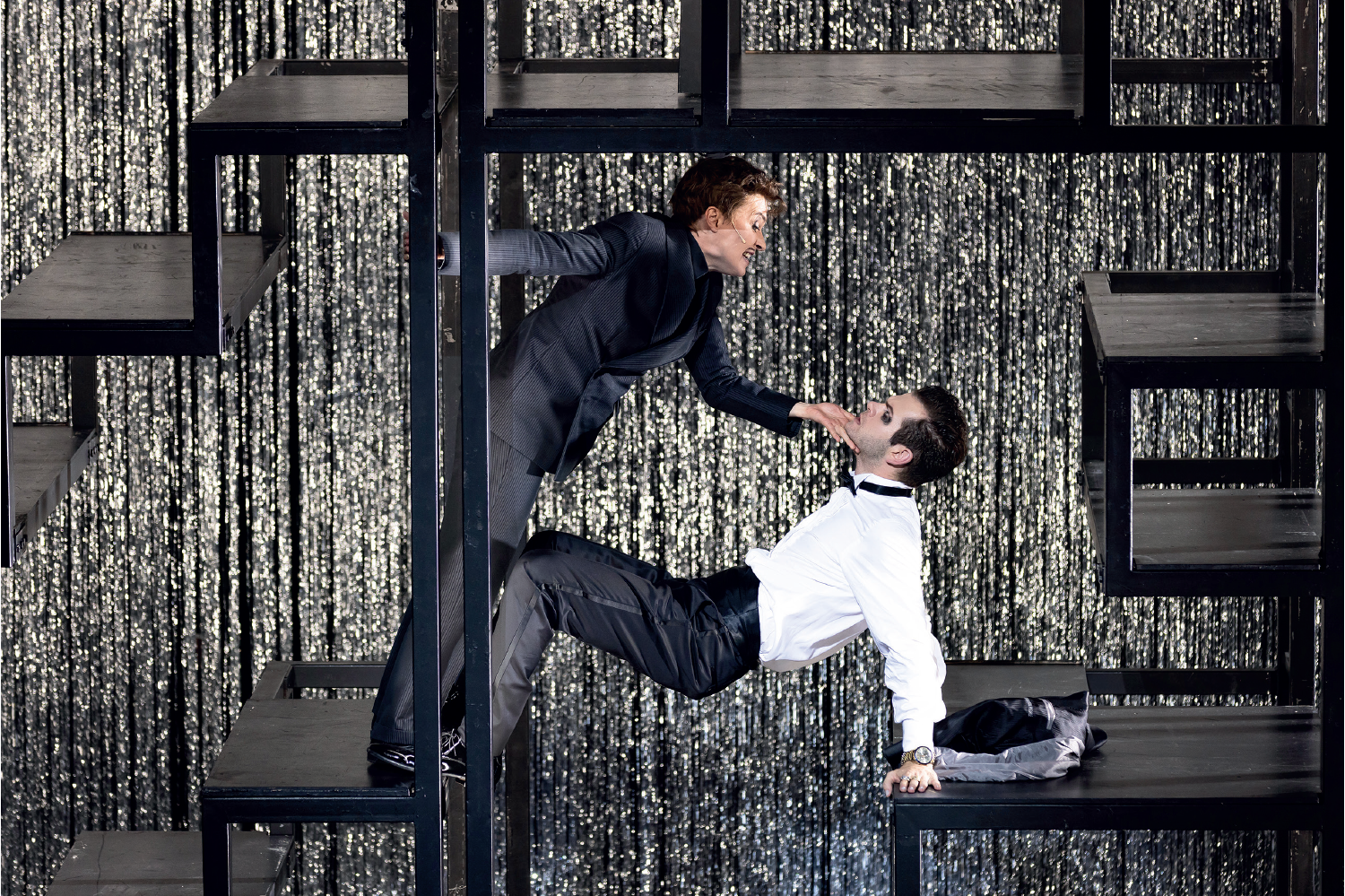 Anyhow, in Edinburgh a glitter curtain shimmered and a pale face goggled through into the spotlight and began to sing. ‘Und der Haifisch, der hat Zähne…’ already it was all there: the sleazy glamour, playfulness and lilting cynicism of Weill and Brecht’s predatory earworm. The set, too – by Rebecca Ringst – was cleverer than it looked. The city (it still comes as a jolt that it’s supposed to be London) was sketched as a Tetris-like climbing frame and the cast clambered around the metalwork or chased each other in parkour-like action. In Kosky’s conception, it’s the performers who provide the show’s dark glitter. In ‘Pollys Abschiedslied’ the backdrop flushed yellow and the characters moved about their frames in silhouette; a moment of beauty wholly stripped of sentimentality.