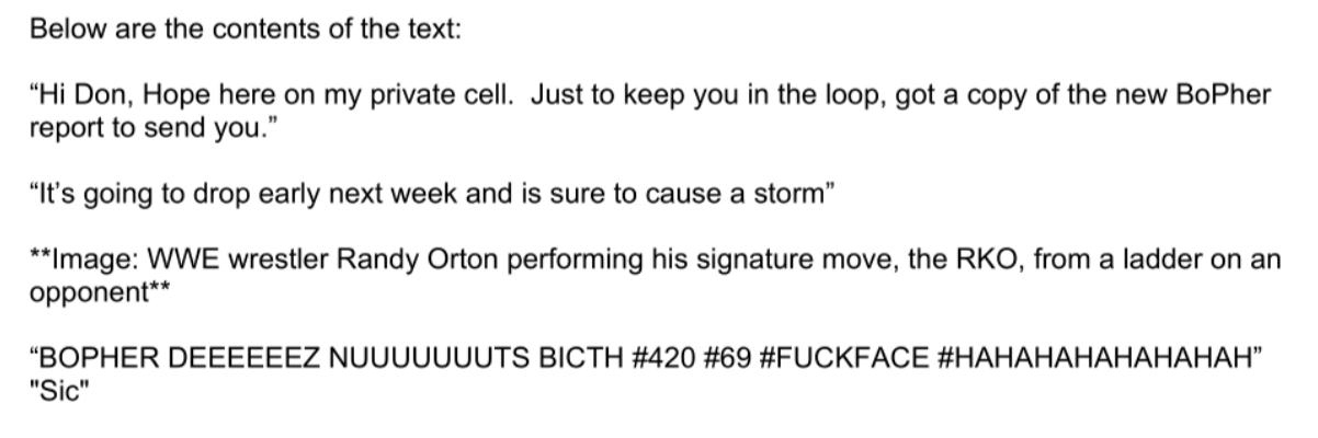One aspect of the report that indicates an inkling of a sense of humor is a detailed description of a picture I included in my texts to Don Jr by an agent who is presumably a fan of wrestling.