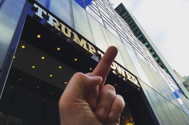 Fast forward twelve years to America’s most polarising and bitter election and the pointers are still coming. It’s just that the proffered finger is no longer the index and the sentiment is rather less good-natured. Stand on the pavement outside the golden entrance to 725 Fifth Avenue – where protesters and supporters now operate a daily circus – and it doesn’t take long to spot a middle-finger salute.